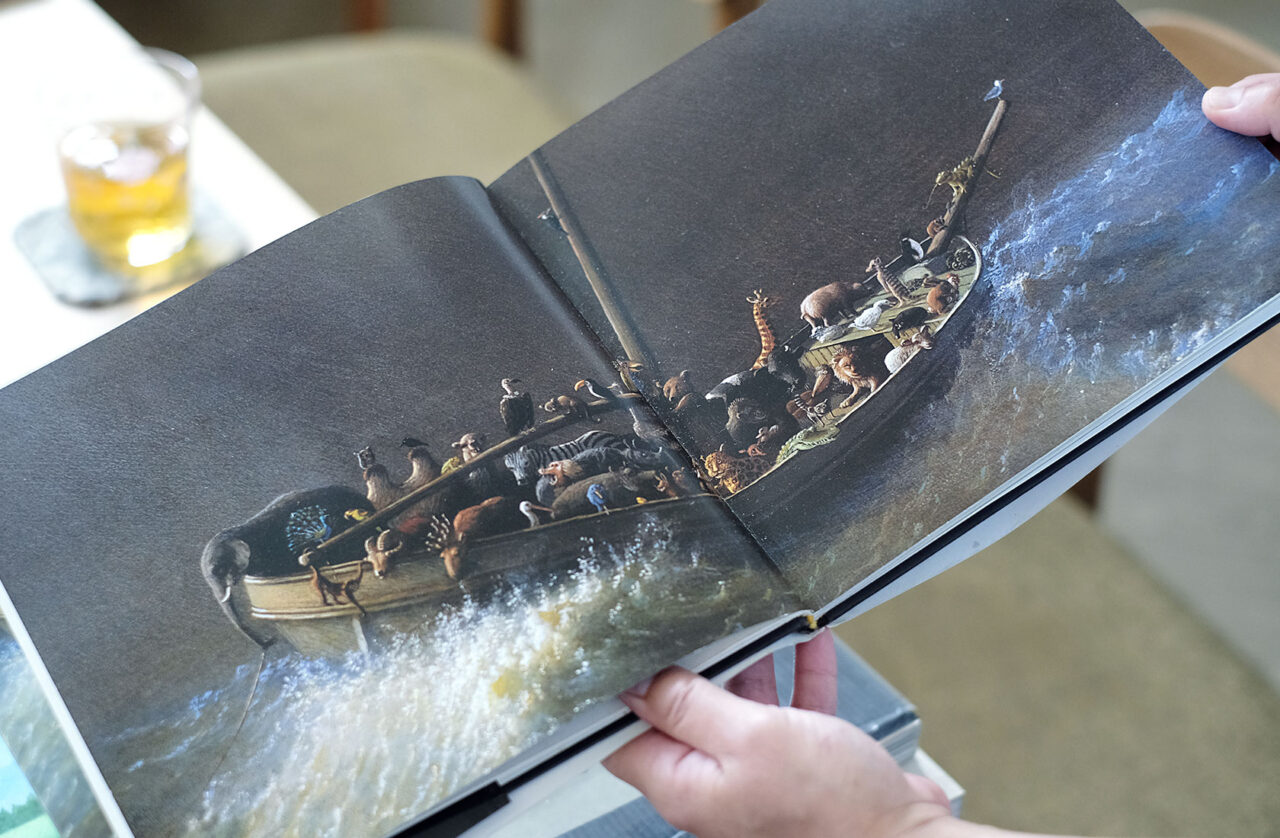 まるやま:大学の時っていろんな作家さんから影響を受けたりするじゃないですか。私は有元利夫さんの絵や、三鷹の森ジブリ美術館で観られる立体が好きでした。絵本作家ではリスベート・ツヴェルガーやミヒャエル・ゾーヴァが好きで、特に舟に動物が乗ってるゾーヴァの「箱舟」という絵がお気に入りで。あと地元に御船(おふね)祭りというお祭りがあるんですけど、船の形の大きな山車の上に人形が乗っていて、「箱舟みたいだな」と思って。好きな要素や気になるモチーフを全部入れたら私らしい作品になるかも?って、この立体作品はできました。