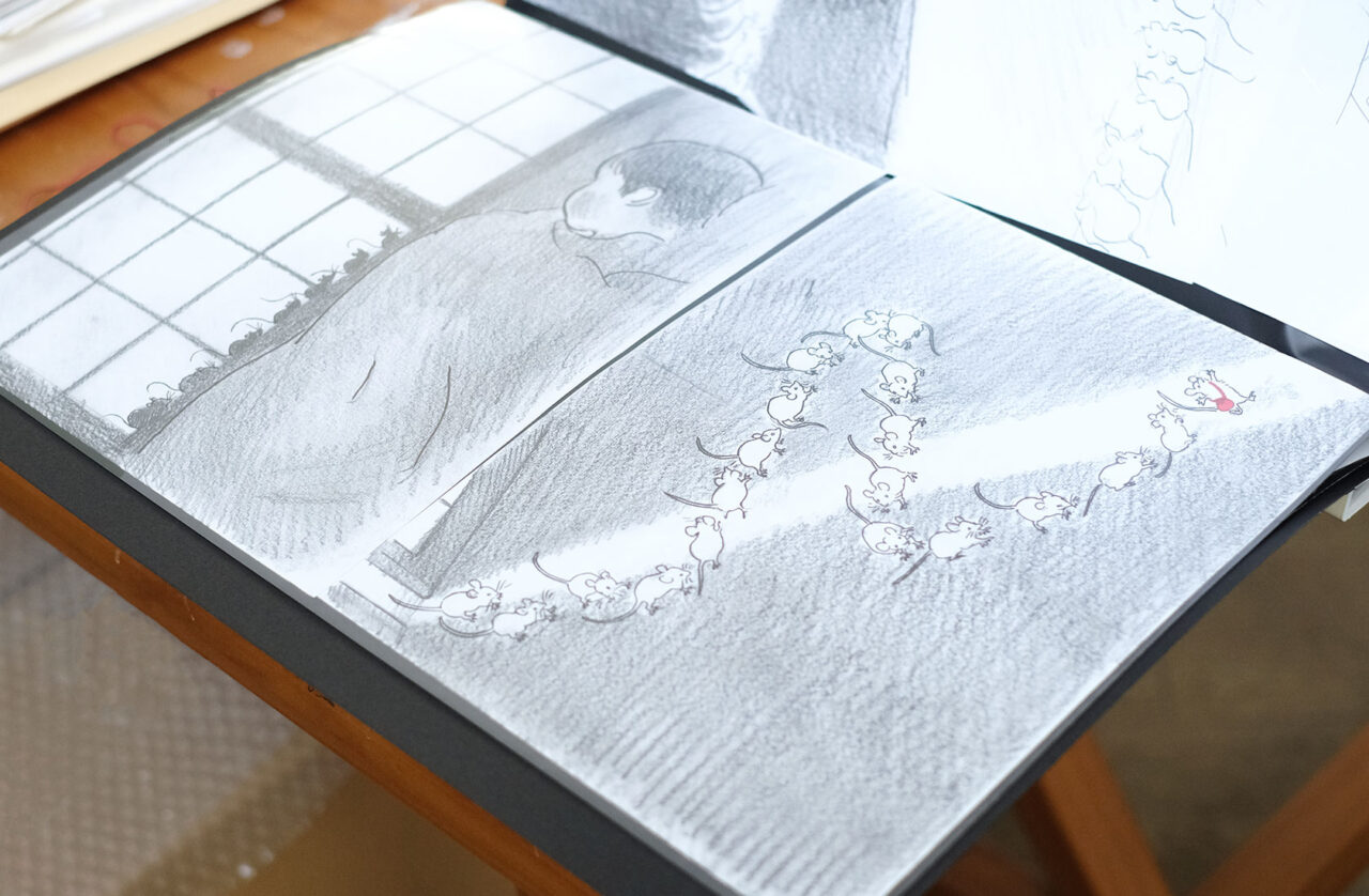 まるやま:想像で描くのはやっぱり難しくて、登場するネズミさんを紙粘土で作ったり、お部屋も段ボールで作って、それを色々な角度から見たり写真を撮ったりして描きました。「下から光を当てたらどんな影になるのかな?」とか色々工夫しましたね。