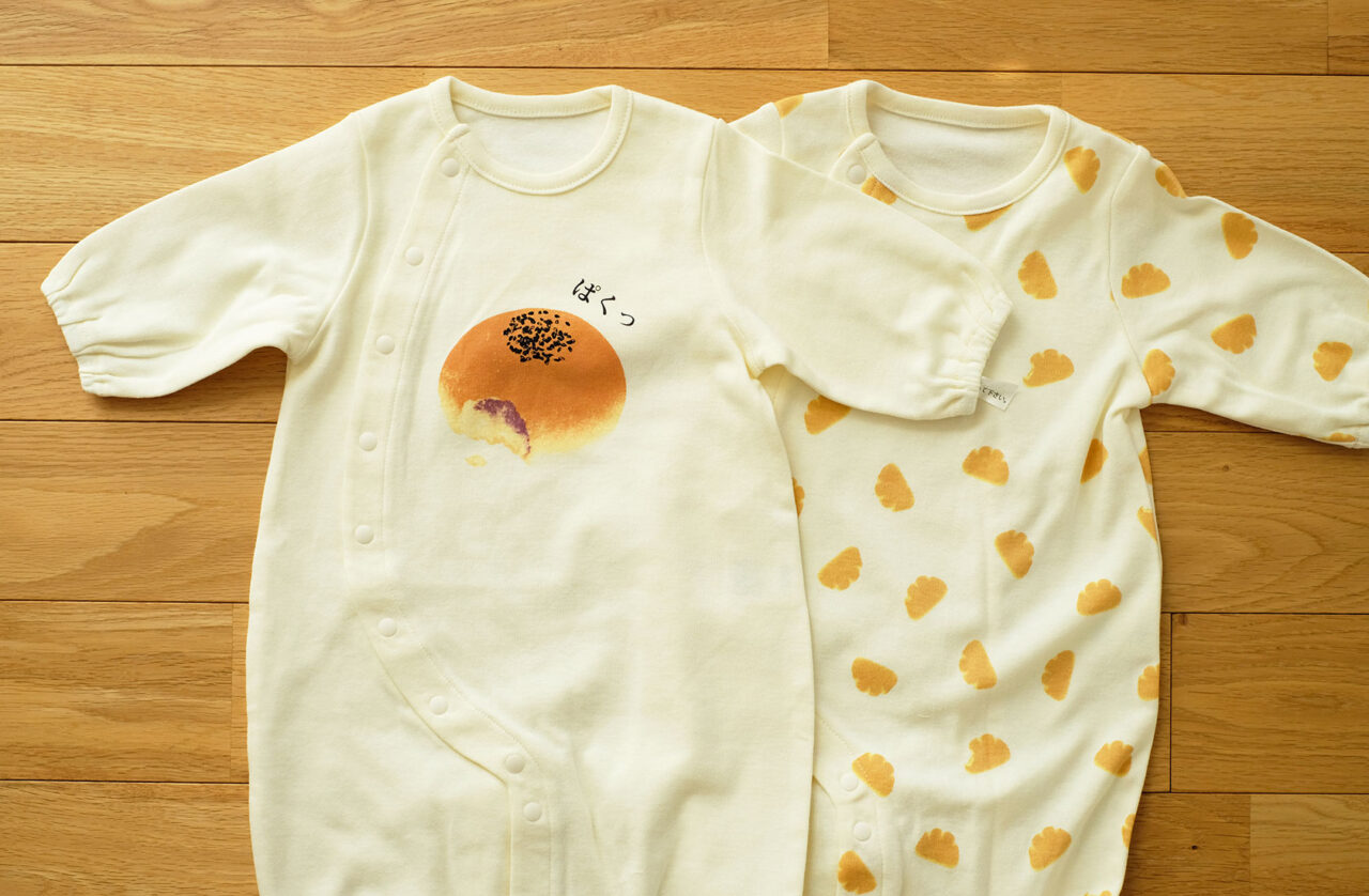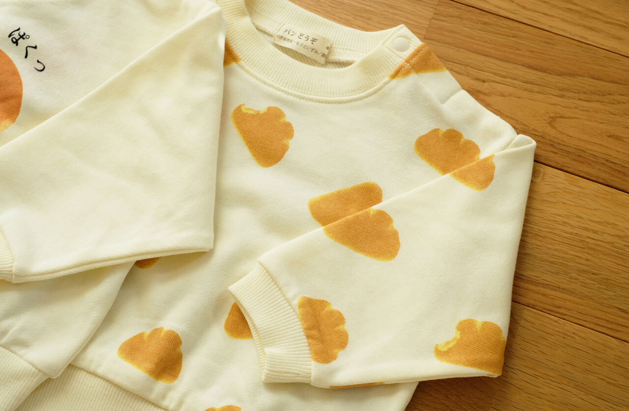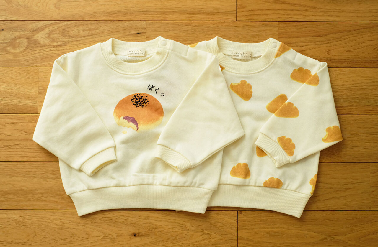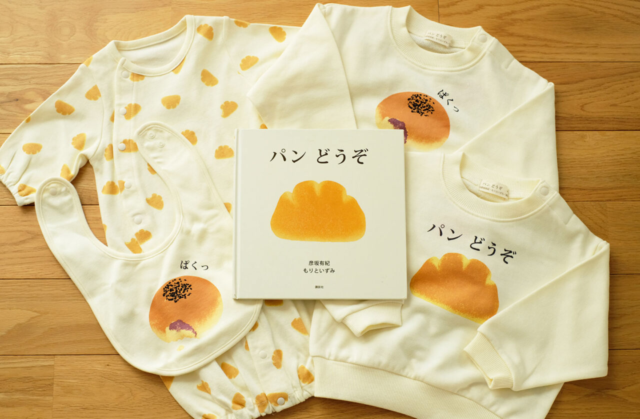 絵本『パンどうぞ』(講談社)が、かわいい長袖トレーナー、ドレスオール、スタイになりました!
