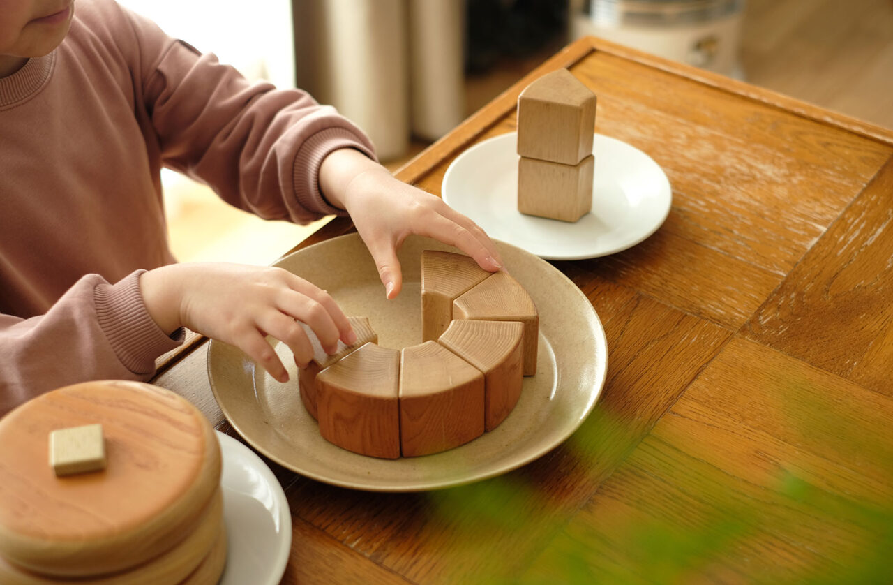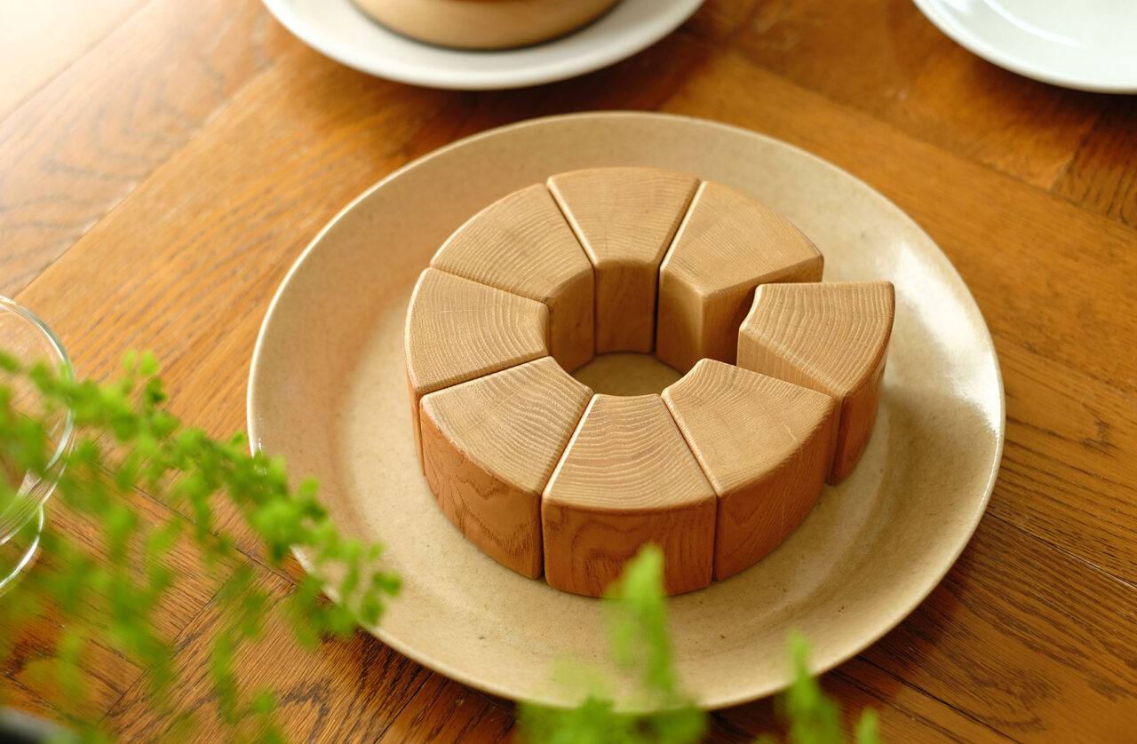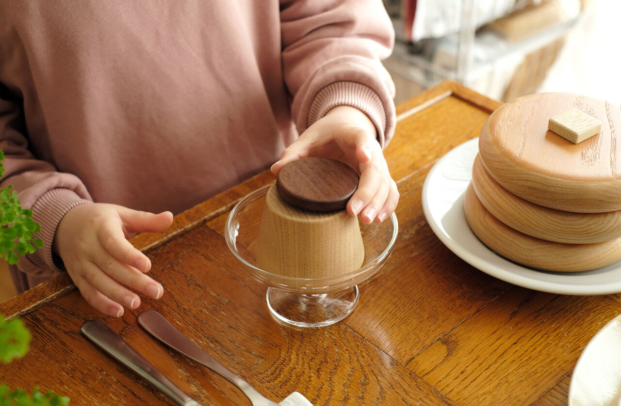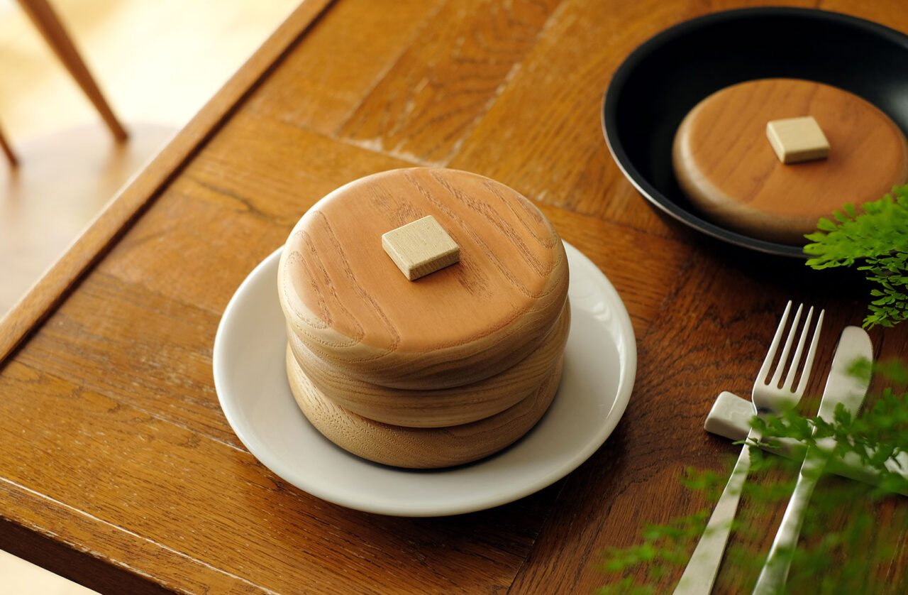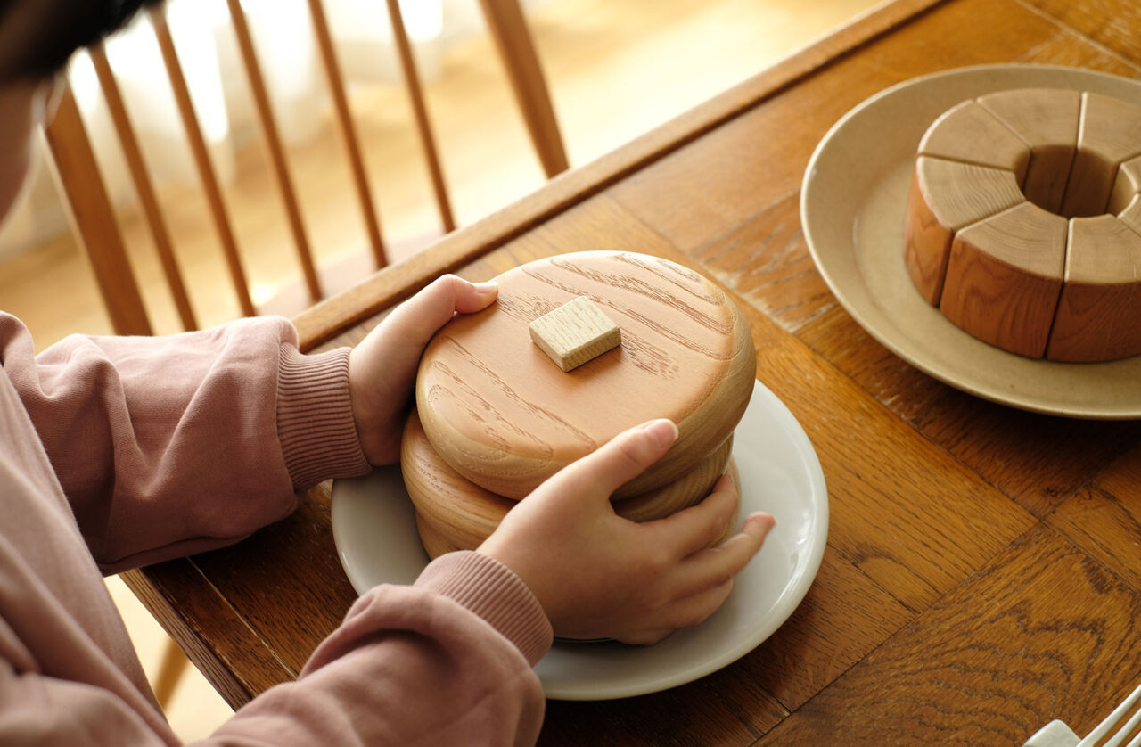 栗の木で作った積み木のおやつ。 ホットケーキ、プリン、バウムクーヘンの3種類を作りました。 出産祝いのプレゼントや、幼稚園などでの教材としてもご活用いただいています。
